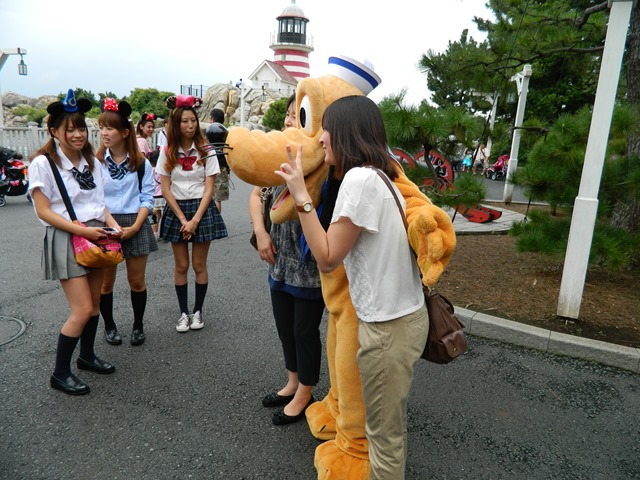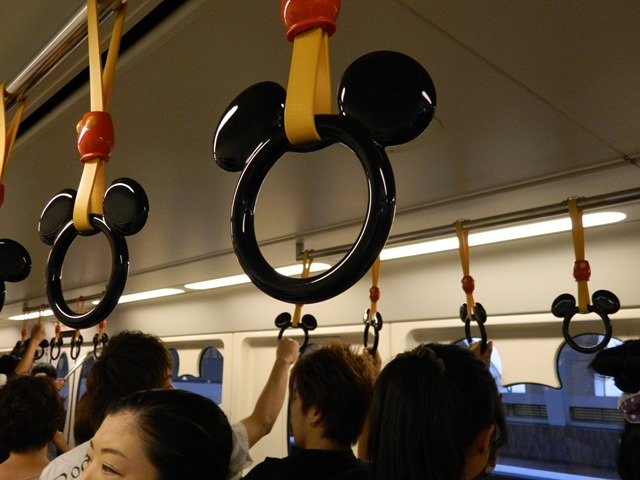 越靠近迪士尼電車上的氣氛越不一樣,在這邊,大家都很會打扮,短到不能再短的裙子,穿著迪士尼衣服、情侶裝,不管男女老少,頭帶著米老鼠唐老鴨的造型帽子,或是直接把頭髮綁出迷老鼠的樣子,要不然就是手拿一直達菲熊